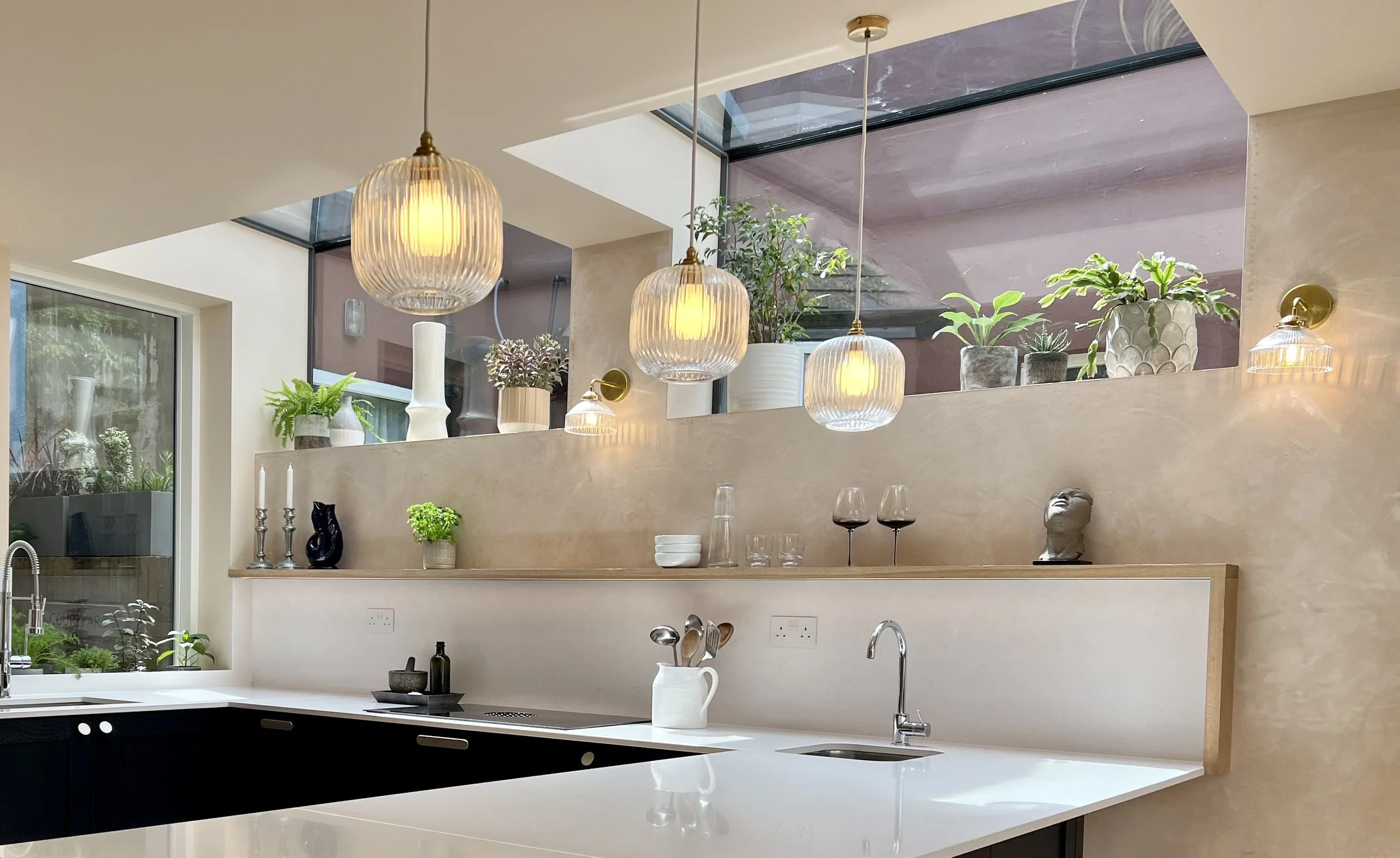 In one of our Decorbuddi projects, we were working with a very low kitchen height, for example. Spark and Bell provided short stems for the reeded glass pendants so that they could hand over the work surface. See here