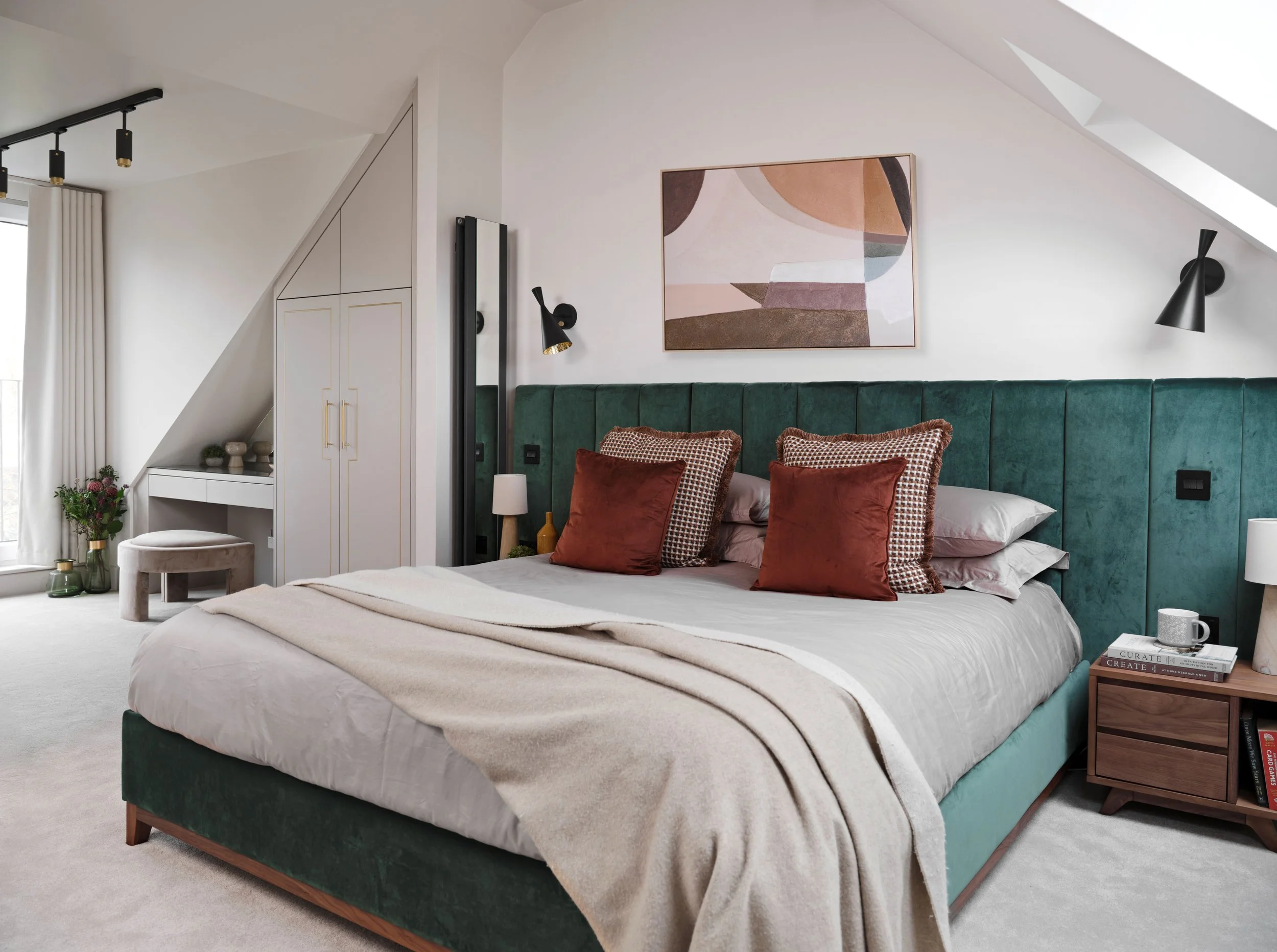 The bedroom was reconfigured around a centrally positioned bed facing the TV, anchored by a statement forest-green upholstered headboard. This not only establishes a strong focal point but also subtly references the leafy views typical of Muswell Hill homes, visible through the Juliet balcony doors.